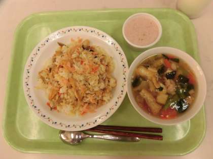 今日の給食は、五目寿司、吉野汁、いちごミルクゼリー、牛乳です。
