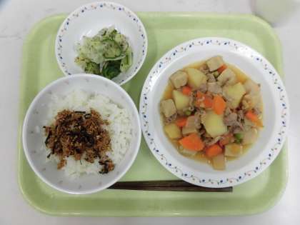 今日の給食は、ごはん、かみかみ佃煮、肉じゃがうま煮、野菜のゆかりかけ、牛乳です。