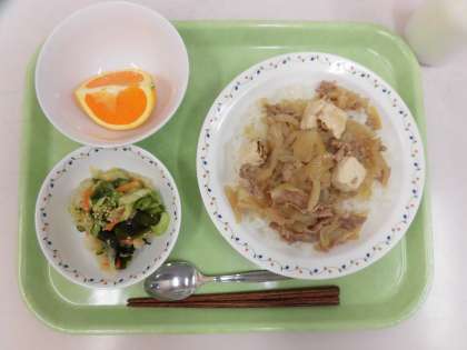 今日の給食は、豚丼、わかめサラダ、清見オレンジ、牛乳です。