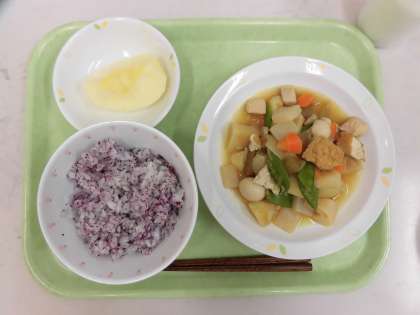 今日の給食は、ゆかりごはん、春野菜のうま煮、りんご、牛乳です。