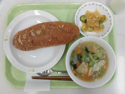 今日の給食は、あげパン、ワンタンスープ、ピリカラ大根、牛乳です。