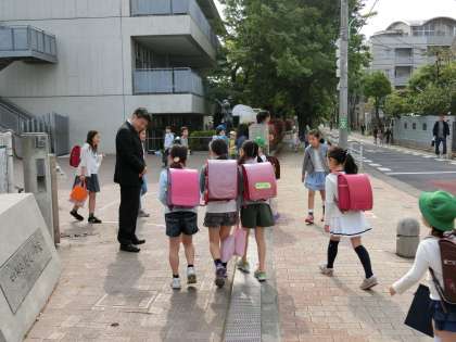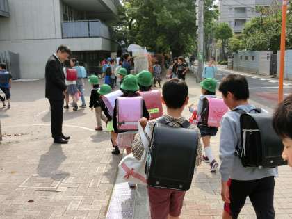 いっぱい遊んだのか、大きなあくびをしながら登校する子と、