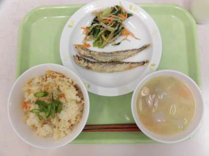今日の給食は、こぎつねごはん、ししゃものからあげ、おひたし、呉汁です。