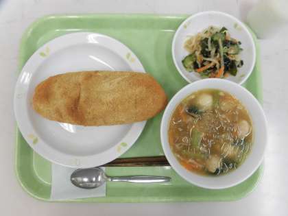 今日の給食は、あげパン、肉団子入り春雨スープ、ごまドレサラダ、牛乳です。