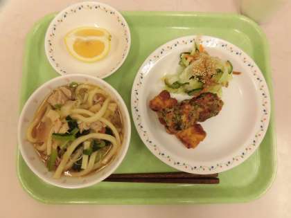 今日の給食は、ちゃんこうどん、ちくわの二色揚げ、ごぼうチップサラダ、ニューサマーオレンジ、牛乳です。