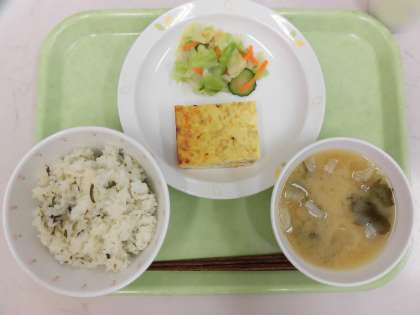 今日の給食は、高菜ごはん、擬製豆腐、ひとしお野菜、じゃがいものみそ汁、牛乳です。