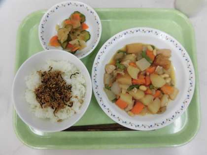 今日の給食は、ごはん、かみかみ佃煮、豆入り筑前煮、シャキシャキ野菜、牛乳です。