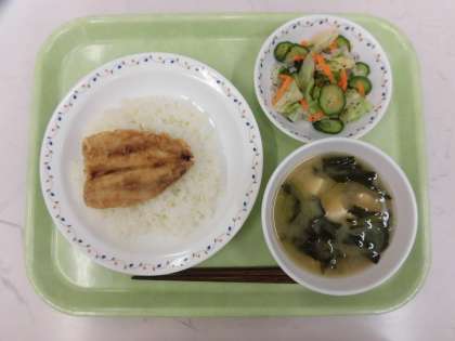 今日の給食は、いわしのかば焼き丼、牛乳、野菜のゆかりかけ、小松菜のみそ汁です。