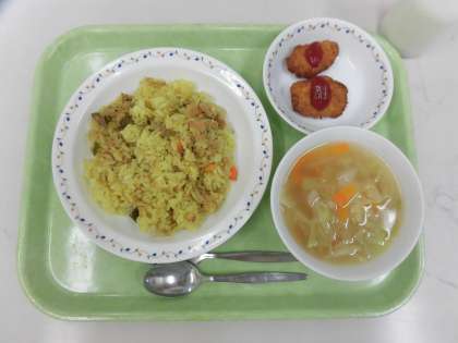 今日の給食は、ツナピラフ、豆腐のナゲット、キャベツスープ、牛乳です。