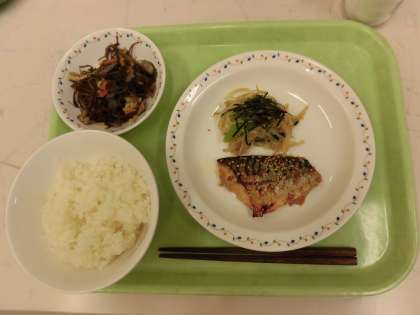 今日の給食は、ごはん、さばの七味焼き、野菜ののりあえ、刻み昆布の五目煮、牛乳です。