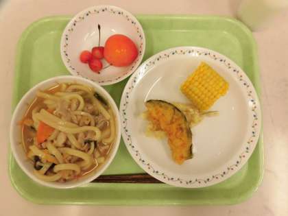 今日の給食は、煮込みうどん、天ぷら(きす、かぼちゃ)、とうもろこし、果物(プラムまたはさくらんぼ)、牛乳です。