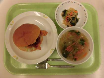 今日の給食は、チキンカツサンド、レタススープ、ごまドレサラダ、牛乳です。