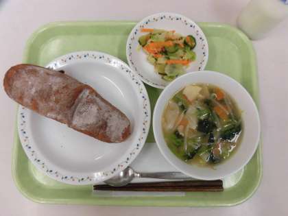 今日の給食は、あげパン(ココア味)、ワンタンスープ、中華サラダ、牛乳です。