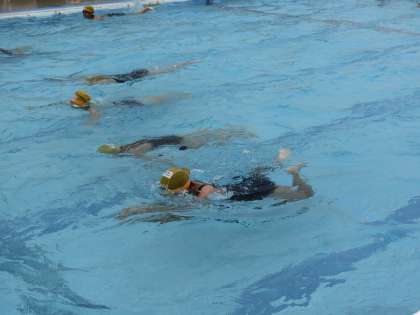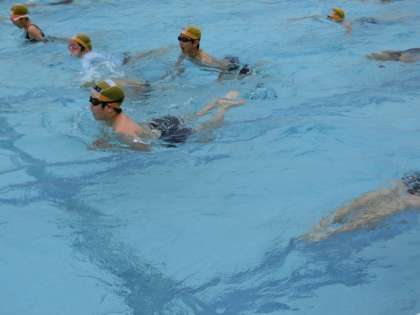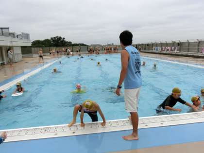 先生に泳法を見てもらいながら正しい泳法をつかむグループと