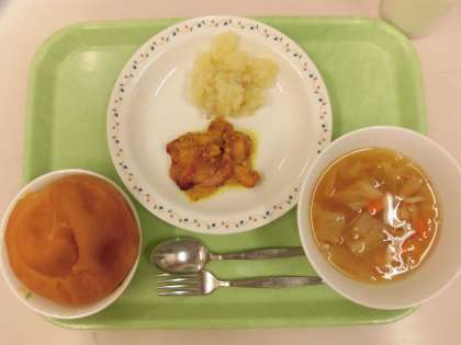 今日の給食は、ミルクパン、タンドリーチキン、ジャーマンポテト、白いんげんの田舎風スープ、牛乳です。