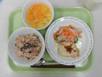 今日の給食は、赤飯、魚のしょうが風味焼き、大根の甘酢かけ、フルーツポンチ、牛乳です。