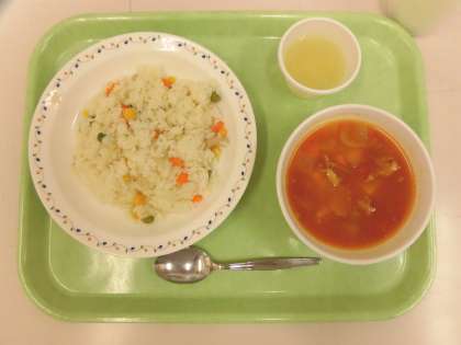 今日の給食は、三色ピラフ、ミネストローネ、パインぜリー、牛乳です。