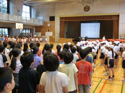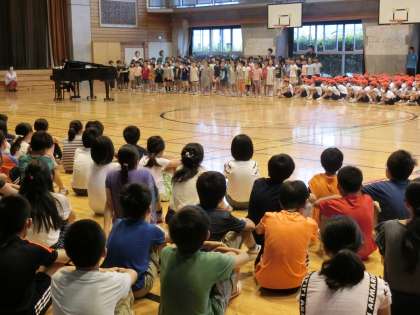 今日の朝は音楽集会でした。雨でジメッとした体育館もこどもたちの元気で明るい