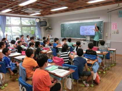 大型画面に子供たちが使っている資料と同じものを