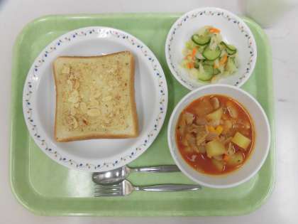 今日の給食は、アーモンドトースト、ポークビーンズ、野菜のイタリアンドレッシングかけ、牛乳です。