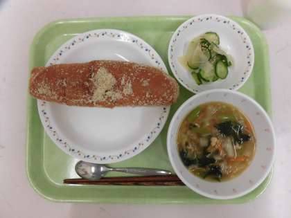 今日の給食は、あげパン、白菜と肉団子のスープ、きゅうりと大根のごま風味、牛乳です。