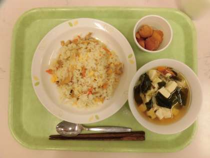 今日の給食は、五目ずし、すまし汁、月見だんご、牛乳です。
