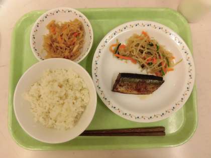 今日の給食は、ごはん、さんまの生姜煮、野菜のからししょうゆかけ、切り干し大根の煮つけ、牛乳です。