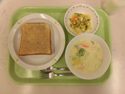 今日の給食は、セサミトースト、さつまいもシチュー、イタリアンサラダ、牛乳です。