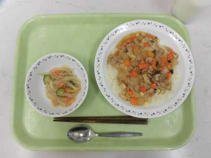 今日の給食は、あんかけチャーハン、春雨サラダ、牛乳です。