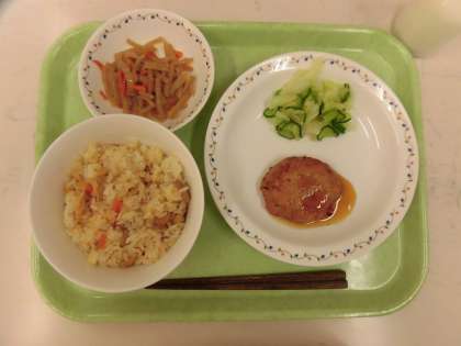 今日の給食は、子ぎつねごはん、つくね焼き、こんにゃくのピリカラ、ひとしお野菜、牛乳です。