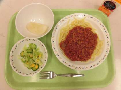 今日の給食は、スパゲティーミートソース、コーン入りフレンチサラダ、梨、オレンジジュースです。