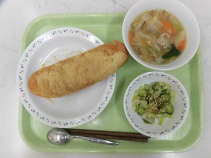 今日の給食は、あげパン、ワンタンスープ、キャベツの華風あえ、牛乳です。