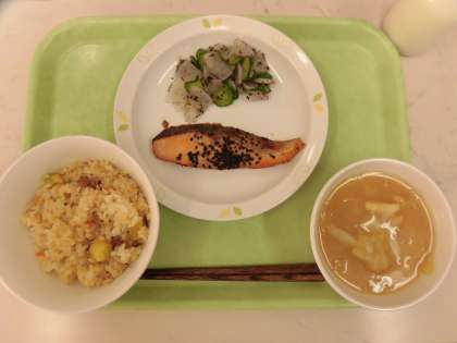 今日の給食は、秋の香りごはん、鮭の南部焼き、大根のゆかりかけ、キャベツの味噌汁です。