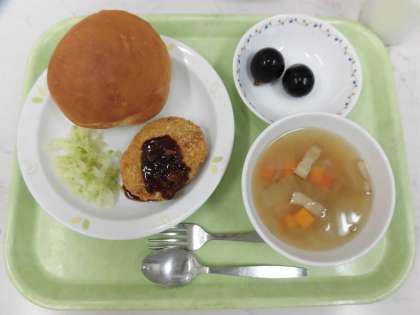 今日の給食は、ミルクパン、コロッケ、キャベツソテー、コンソメスープ、ぶどうです。