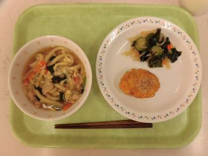 今日の給食は、かきたまうどん、五平もち、和風サラダ、牛乳です。