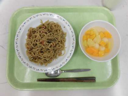 今日の給食は、ソースやきそば、フルーツ白玉、牛乳です。