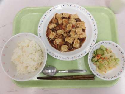 今日の給食は、ごはん、四川豆腐、中華サラダ、牛乳です。