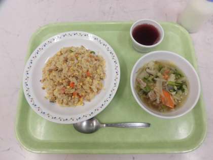 今日の給食は、チャーハン、中華スープ、ぶどうゼリーです。