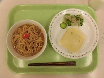 今日の給食は、担々麺、てりやきまん、きゅうりと大根のごま風味、牛乳です。
