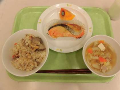 今日の給食は、里芋ごはん、鮭のみそマヨネーズ焼き、豆腐汁、柿です。
