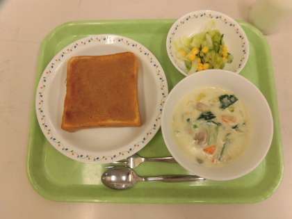 今日の給食は、きな粉バタートースト、季節野菜のクリームシチュー、コーン入りフレンチサラダです。