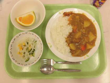 今日の給食は、カレーライス、ジョア、福神漬、大根サラダ、スイートスプリングです。