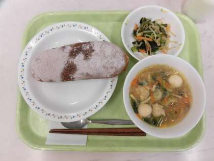 今日の給食は、あげパン(ココア)、肉団子入り春雨スープ、ごまドレサラダです。