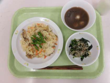 今日の給食は、とりめし、ほうれん草の乾物あえ、白玉しるこです。