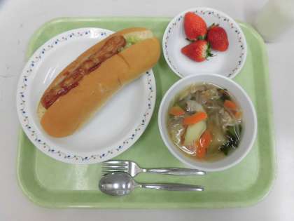 今日の給食は、セルフウインナーサンド、ベーコンと白菜のスープ煮、いちご、牛乳です。