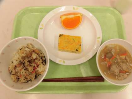今日の給食は、ひじきごはん、卵焼き、とびうおのつみれ汁、せとか、牛乳です。
