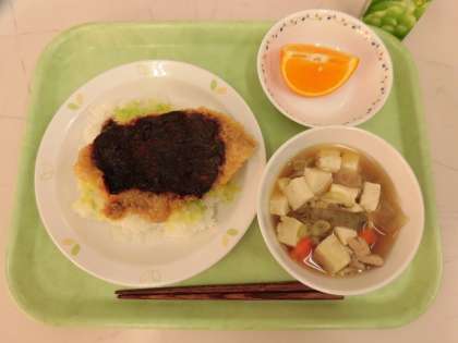 今日の給食は、みそかつ丼、けんちん汁、天草オレンジ、マスカットキャベツジュースです。
