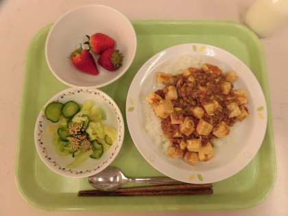 今日の給食は、麻婆豆腐丼、野菜のごま風味、いちご、牛乳です。