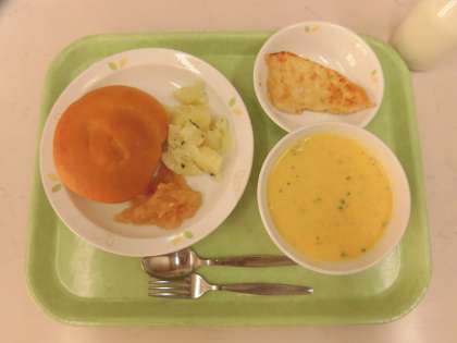 今日の給食は、ミルクパン、魚のマリナード焼き、粉ふきいも、キャロットポタージュ、手作りりんごジャム、牛乳です。