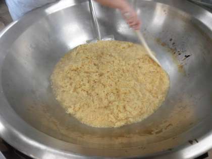 釜にりんごを入れ、グラニュー糖をかけて少しおくと、りんごから水分が出ます。